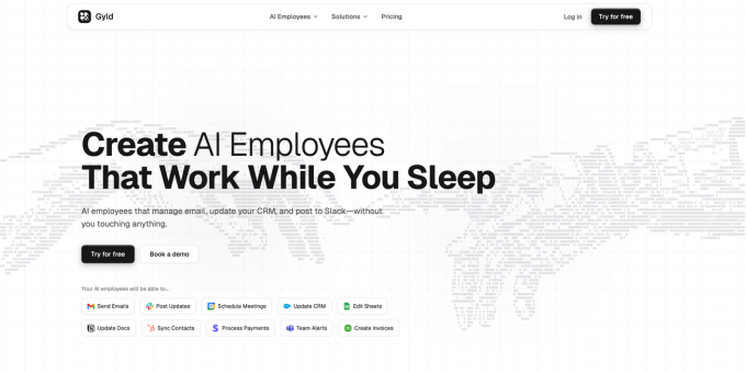 Gyld is a platform that lets businesses create AI employees that automate everyday work across the tools they already use. These AI employees can send emails, update CRMs, post to social media, schedule meetings, manage orders, process payments, sync contacts, create invoices, and more — all without manual intervention. Users simply tell their AI employee what to do, and it handles the rest 24/7 across integrated apps like Gmail, Outlook, Salesforce, HubSpot, Shopify, Stripe, Slack, Notion, QuickBooks, and dozens more.