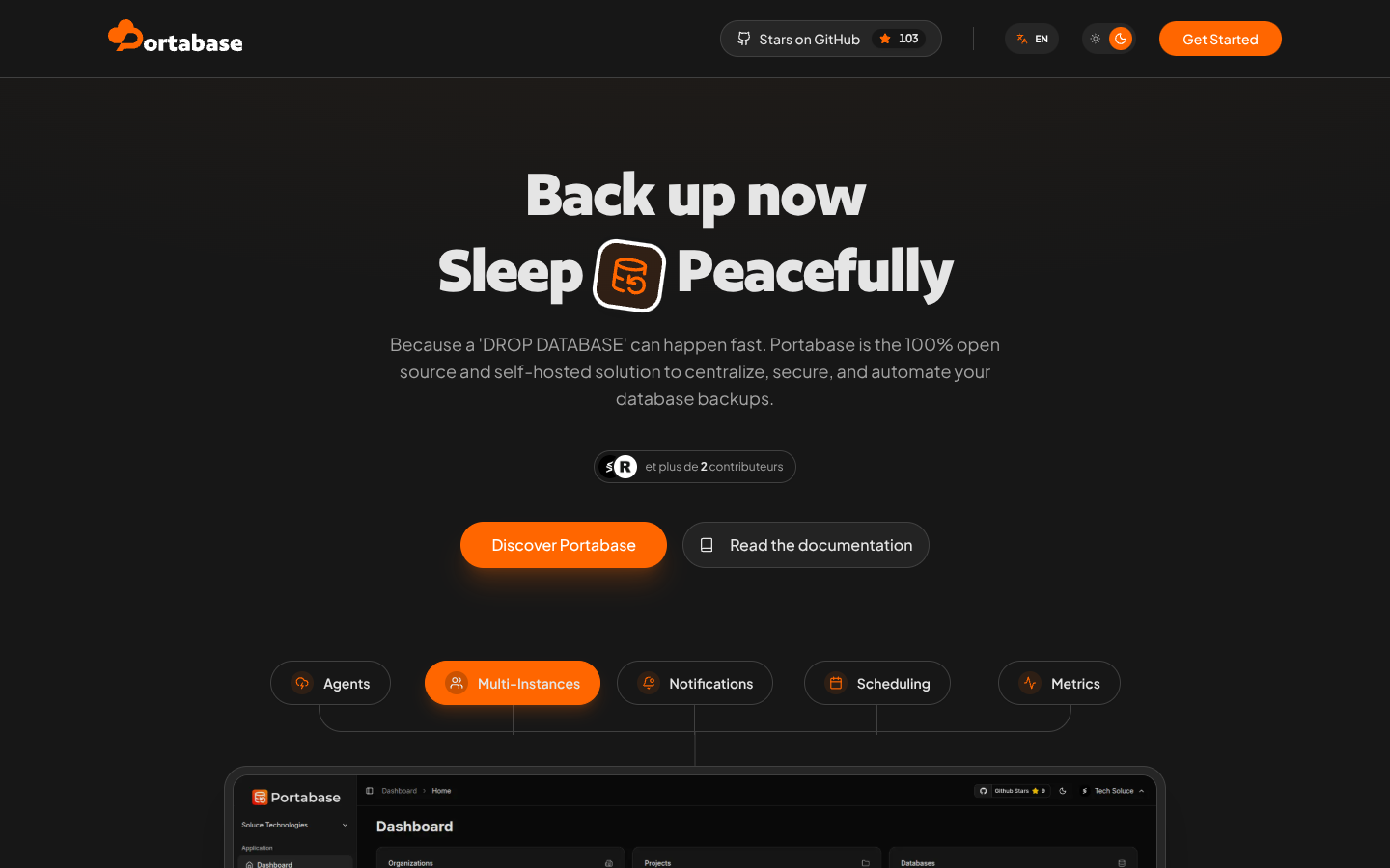 Portabase is a self-hosted, open source database backup orchestration system for DevOps and DBAs. It centralizes automated backups, retention, and restores across PostgreSQL, MySQL, and MariaDB, keeping all data within your infrastructure while providing secure agents, scheduling, and incident notifications.