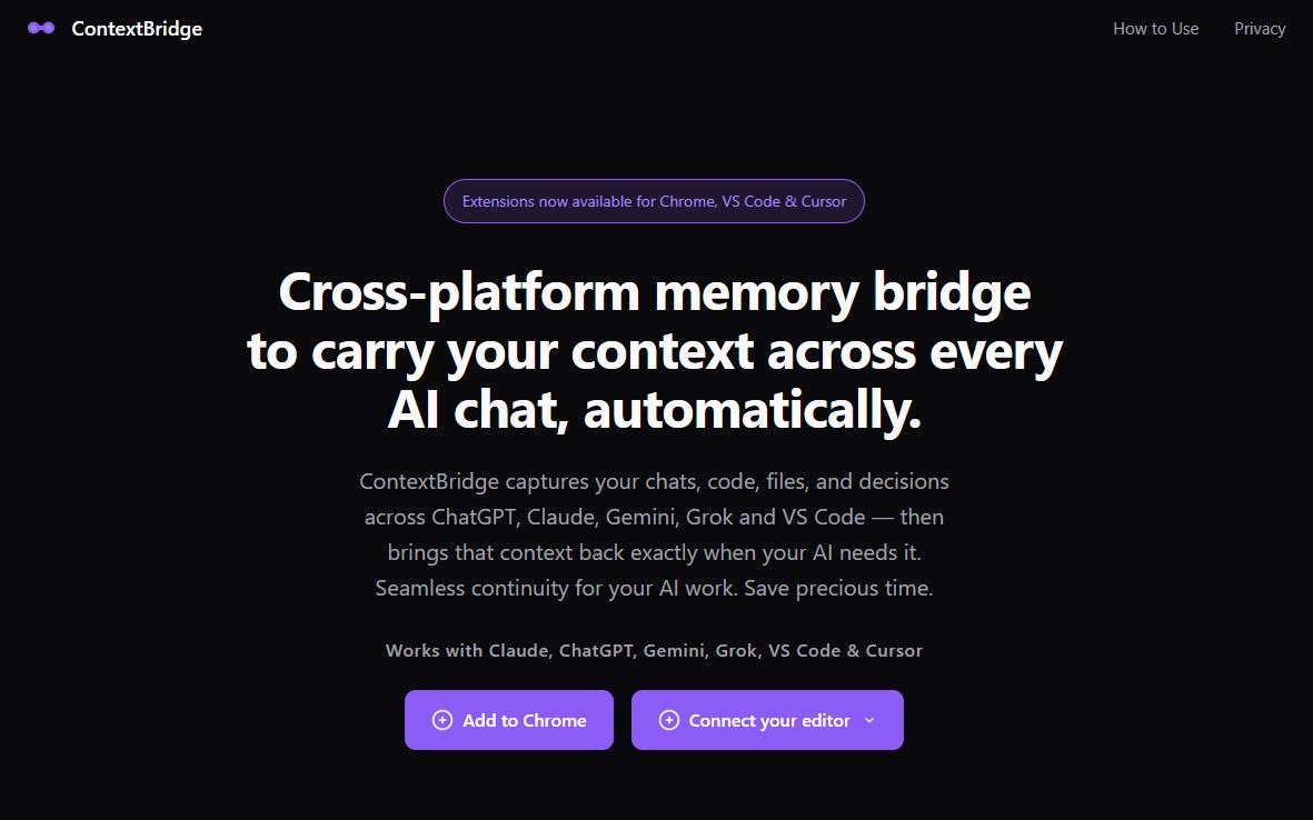 ContextBridge captures your chats, code, files, and decisions across ChatGPT, Claude, Gemini, Grok, VS Code and Cursor β€” then brings that context back exactly when your AI needs it. Seamless continuity for your AI work, saving hours of precious development or research time.