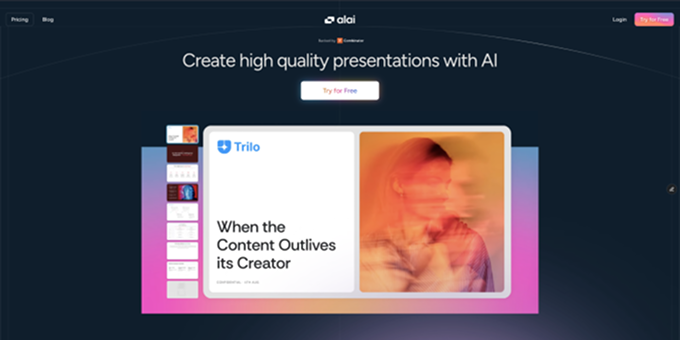 Alai helps you create high-quality presentations faster using AI. Get multiple polished slide options from plain text and refine them on a responsive canvas.