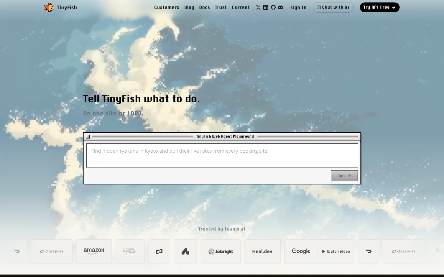TinyFish provides production-ready web operations infrastructure for AI agents, combining semantic web understanding, serverless browsers, and built-in proxies to automate large-scale web interactions. It lets teams turn complex, unstructured websites into real-time, structured data while minimizing LLM usage and operational overhead.