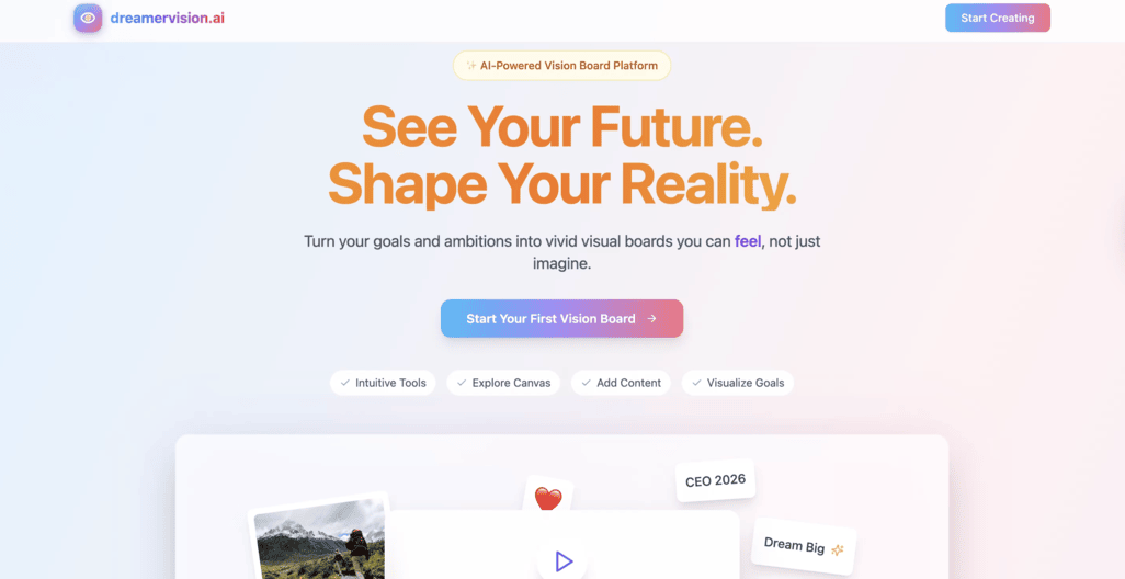 Dreamervision.ai is an AI-powered digital vision board that helps people visualize their goals, dreams, and future selves. Create boards using images, text, GIFs, audio, and AI dream renders that place you inside your imagined life. Designed to be calm, intuitive, and distraction-free, dreamervision.ai replaces physical vision boards with a faster, cleaner, and more powerful digital experience.