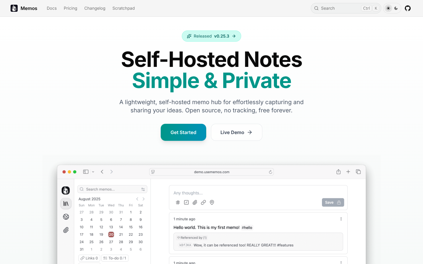 Memos is a self-hosted knowledge capture system for fast, distraction-free note taking and private idea organization. It helps you quickly record, connect, and search notes in your own infrastructure, creating a secure, long-term personal knowledge base.