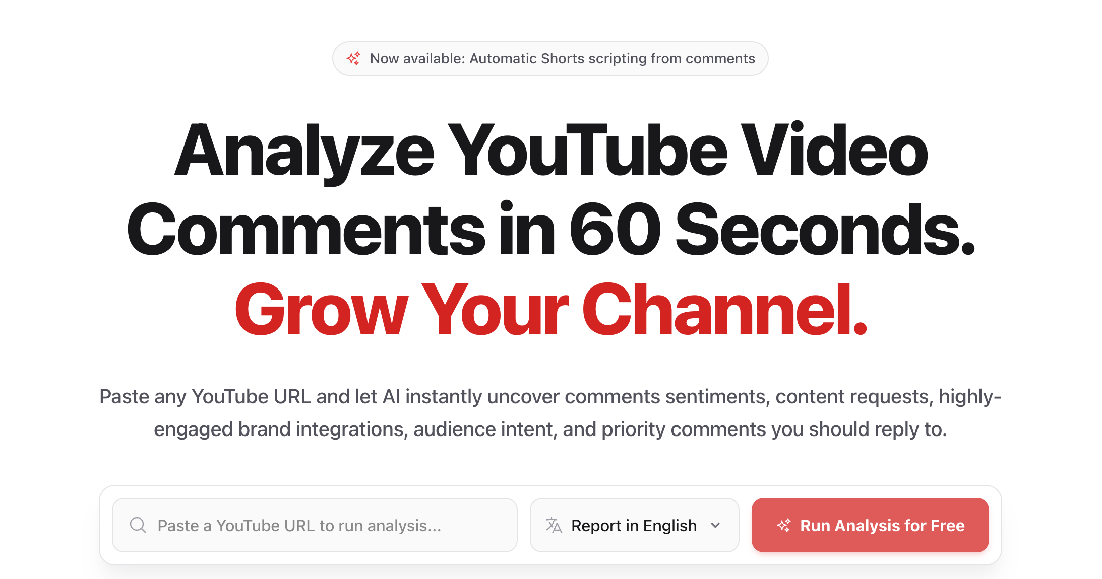 Understand the Comment Section. Grow Your Channel Faster. Tap into the hidden signals in your audience's comments. Paste any YouTube URL and let AI run for FREE. Paste any YouTube URL and let AI instantly uncover comments sentiments, content requests, highly-engaged brand integrations, audience intent, and priority comments you should reply to.