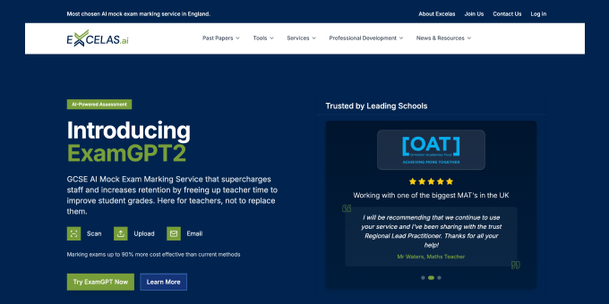 ExamGPT, developed by Excelas, is an AI-powered marking system for GCSE STEM subjects. Accessible through our school portal, the system offers educators a robust solution with over 90% marking similarity to UK schools. By integrating its core capabilities with advanced language models like ChatGPT, the system generates comprehensive marking data tailored to established educational formats. It is designed to be fully customizable to specific school requirements and can process scanned exam papers directly.