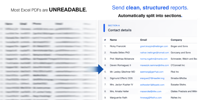 - Automatically splits wide Excel tables across multiple PDF pages instead of cramming everything into unreadable tiny text