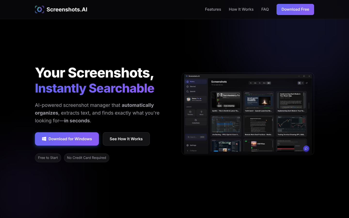 Screenshots.AI turns your screenshots into a searchable visual memory, using AI to index content, extract text, and detect URLs. It auto-organizes captures into smart collections, timelines, and insights while letting you chat with your screenshot history to quickly rediscover information.