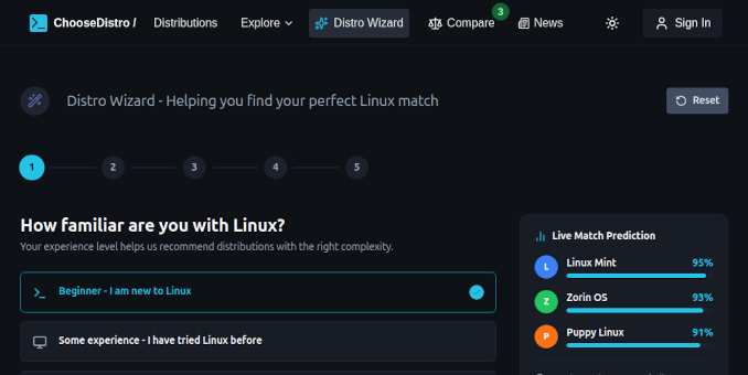 It is a free web tool that helps you pick a Linux distribution that matches what you need. The feature I spent the most time building is the Distro Wizard. It is a multi-step questionnaire that recommends the best distro for your needs. You can also compare distributions up to 3 at a time side-by-side.