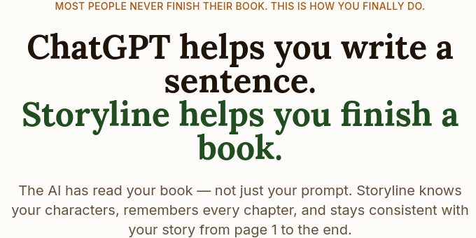 Most people never finish their book because they lose structure. Storyline solves that. It builds your full book blueprint first — including characters, chapters, and direction — then guides you chapter by chapter until you finish. It remembers your story, keeps your voice consistent, and prevents contradictions. Start from scratch or import a draft and turn your ideas into a finished manuscript.