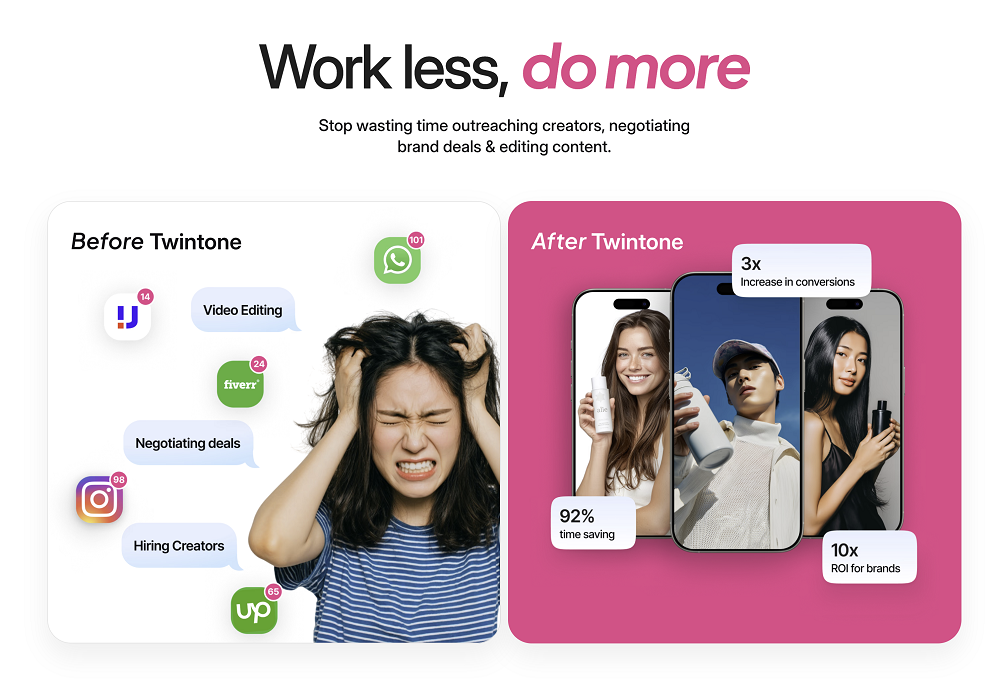 TwinTone brings creators and brands into the AI age. Creators make AI Twins that film, stream, and promote nonstop. Brands get endless authentic videos no cameras, no delays. Automated. Realistic. Human. TwinTone is content creation reimagined.
