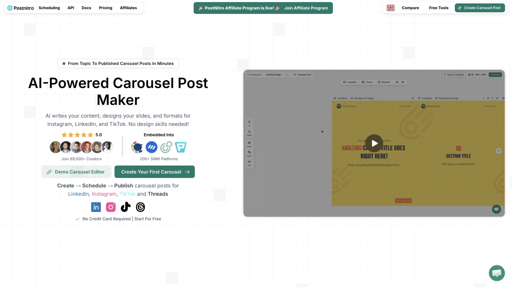 PostNitro.ai is an all-in-one content creation and distribution platform designed to help creators and businesses generate and schedule high-performing social media carousels in seconds. By combining advanced AI models like latest GPT and Claude models with professional design automation and an integrated content planner. PostNitro streamlines your entire social media workflow—from initial idea to final publication.