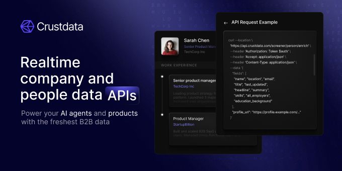 Crustdata provides real-time B2B company and people data via powerful APIs built for AI agents. Teams use Crustdata to power sales, recruiting, and investment workflows with fresh signals like job changes, funding rounds, hiring trends, and profile updates. Our APIs support advanced search, enrichment, and monitoring making it easy for AI agents to find the right targets, keep track of changes, and take action in real time.