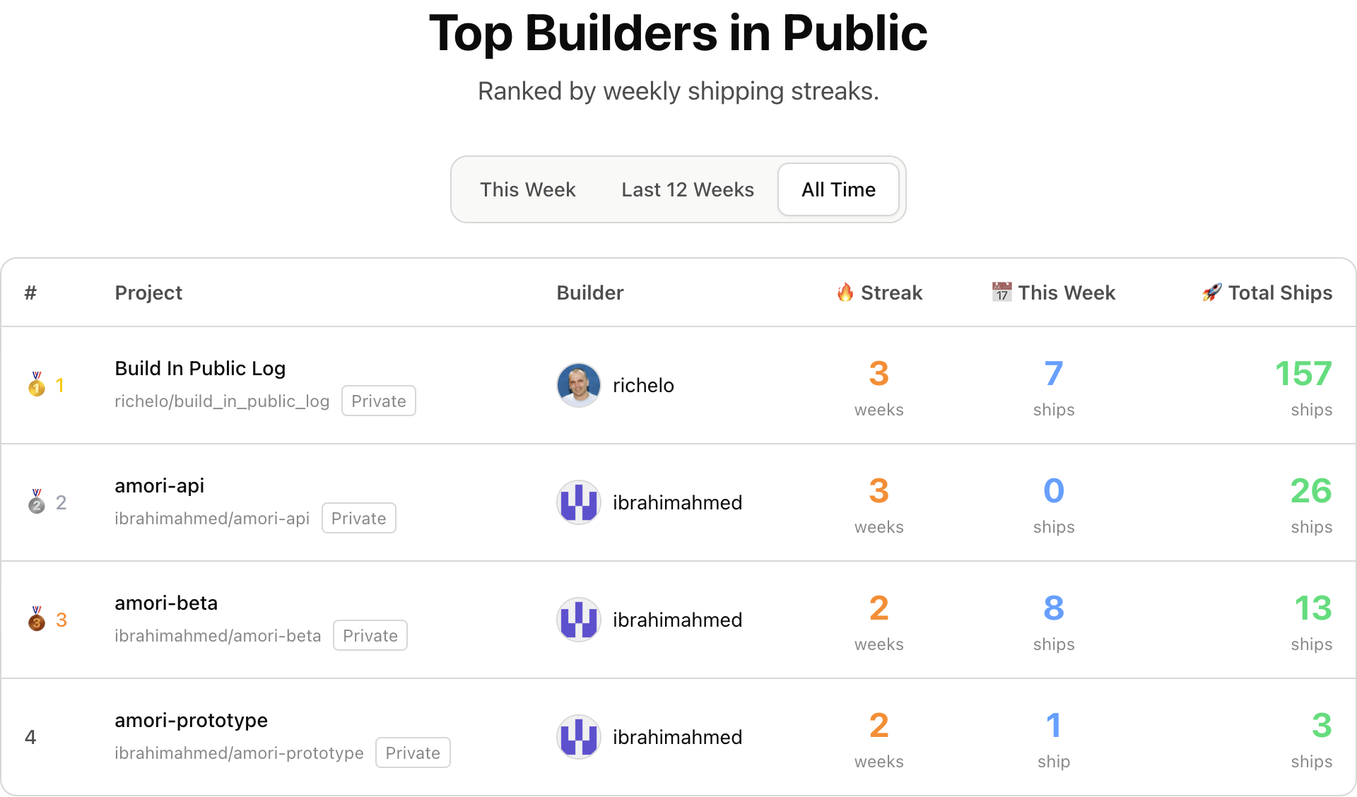 BuildInPublicLog is a public leaderboard that ranks builders by one metric that truly matters: consistency. Instead of measuring success by followers, revenue, or funding, we celebrate the builders who show up week after week and ship. Your streak represents your dedication, discipline, and commitment to building in public. Connect your GitHub account, track your commits across repositories, and watch your shipping streak grow. Every week you ship code, you extend your streak. Miss a week, and it resets.