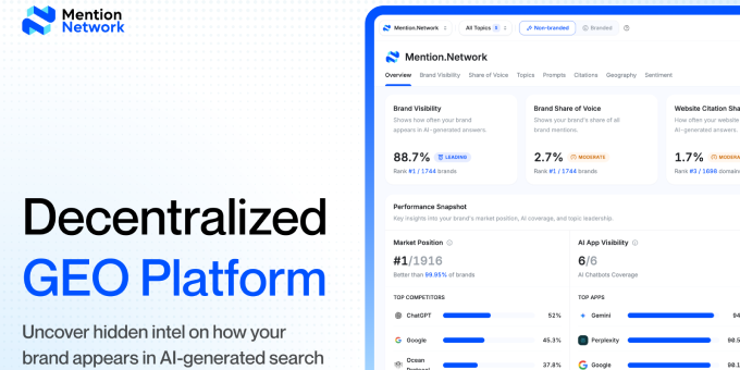 Mention Network is the first decentralized network that provides a comprehensive toolkit for analyzing AI visibility and helping your brand grow in the AI era.
