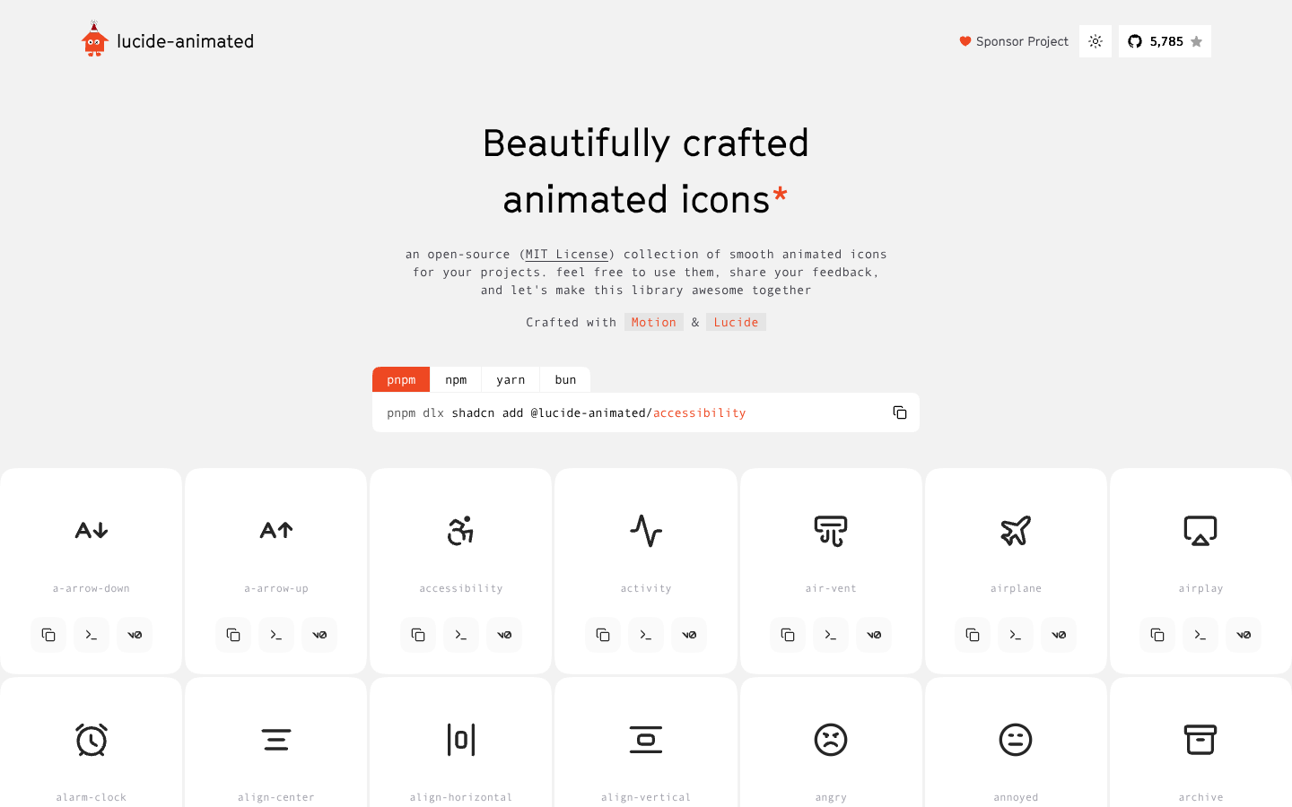 Lucide Animated is an MIT-licensed library of smooth animated icons built on Lucide, ready for modern web interfaces and design systems. Developers can quickly integrate polished motion into dashboards, UI states, and product experiences using familiar JavaScript package managers.