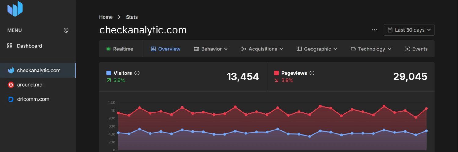 CheckAnalytic is a simple, privacy-friendly web analytics tool built for website owners who want clean traffic data without the complexity of Google Analytics. No cookies, no consent banners, no bloat. Just install a lightweight <1kB script and start seeing realtime visitors, traffic sources, pages, and geographic data instantly. GDPR, CCPA, and PECR compliant out of the box. Free plan available. Starting at $10/mo.