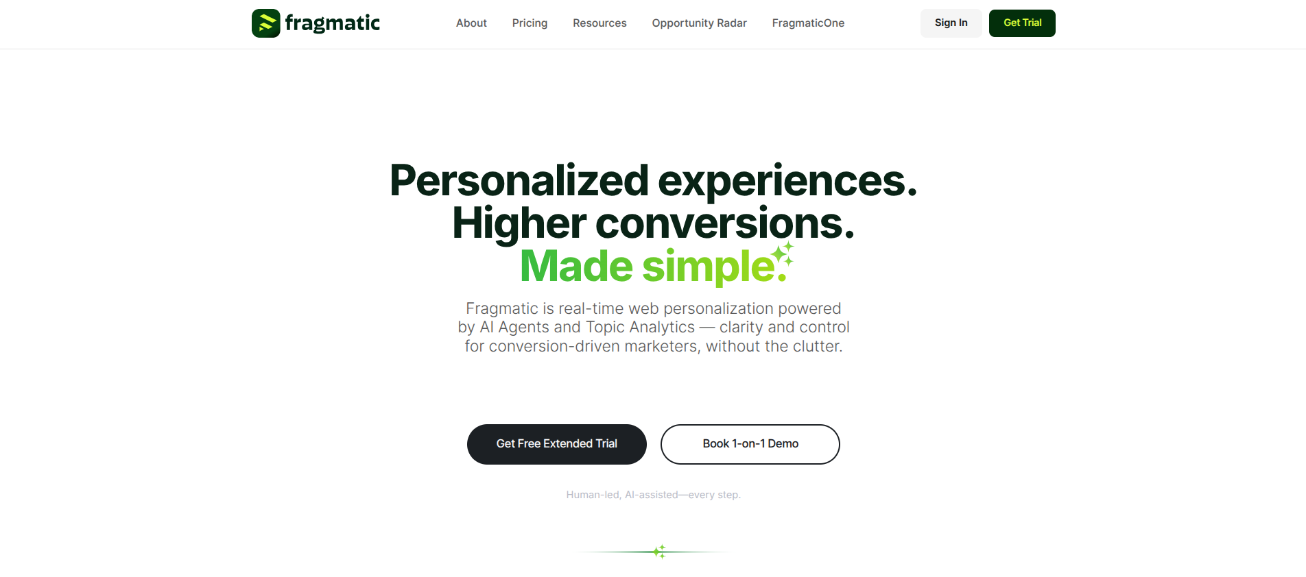 Fragmatic is an AI-powered personalization platform that connects your analytics, content, and audiences into one continuous learning loop. It uses specialized AI Agents and a Topic Analytics engine to reveal intent, guide experiments, and optimize conversion—all in real time, with full marketer oversight.
