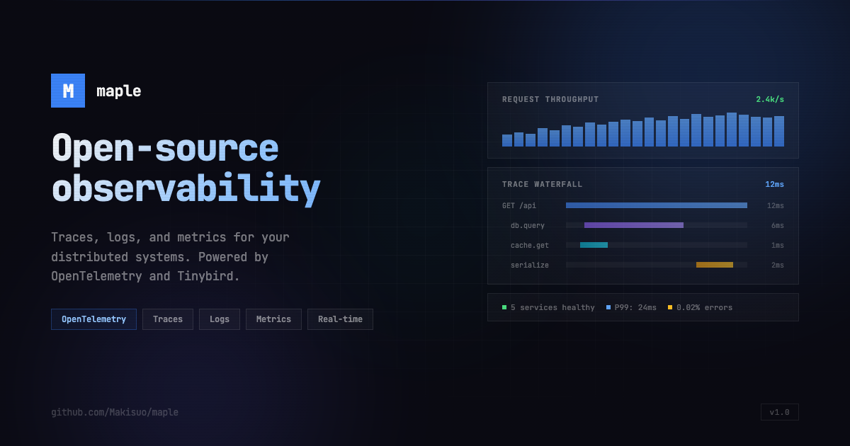 Maple is an OpenTelemetry-native observability stack that unifies traces, logs, and metrics with AI-assisted diagnostics. Engineering teams use it to debug microservices, investigate performance issues, and query massive telemetry datasets in milliseconds.