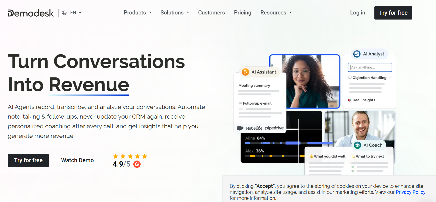 - Demodesk automatically records and transcribes every sales call so you don't miss any important details or coaching moments