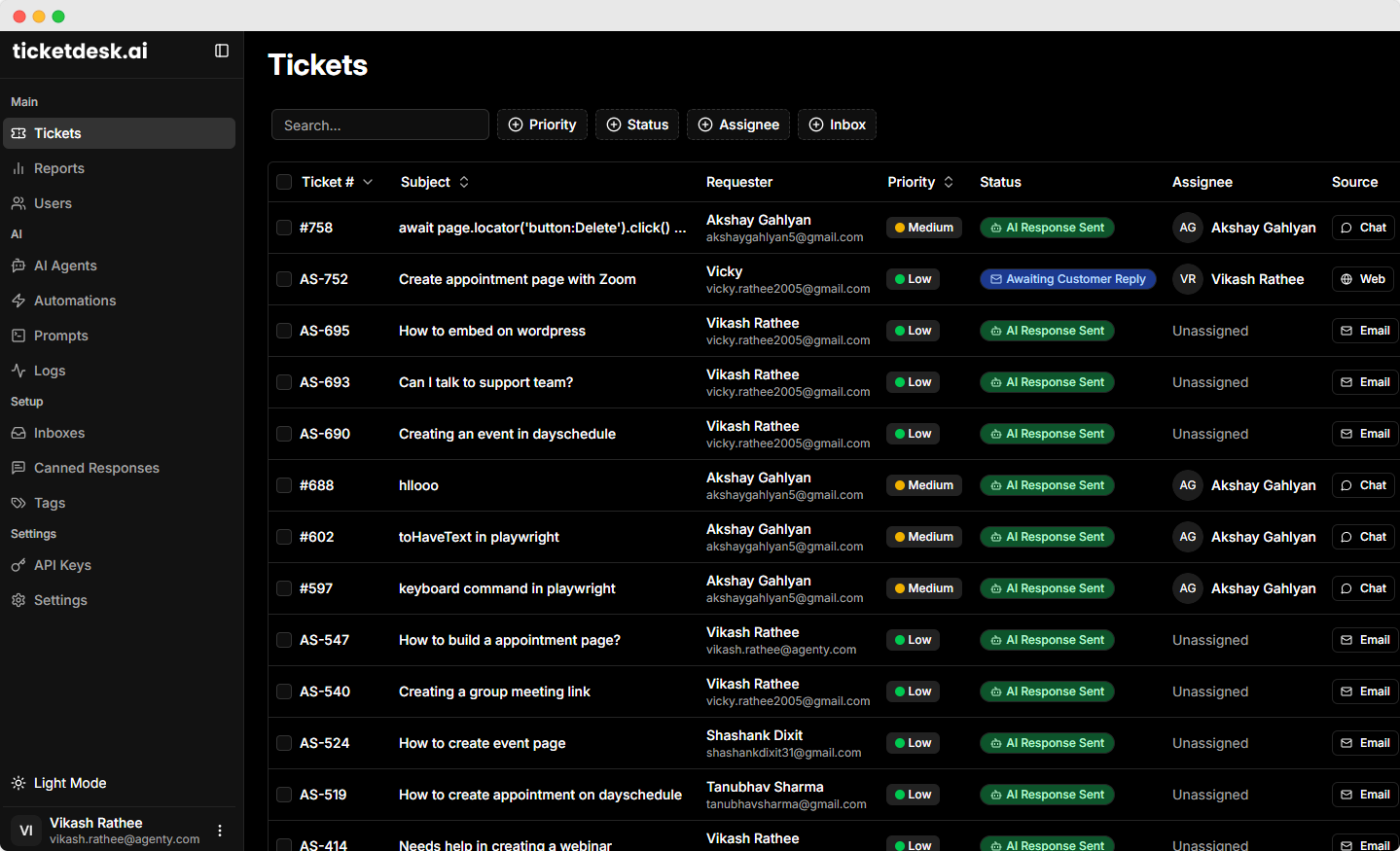 - Ticketdesk automatically reads incoming tickets and assigns them to the right team members based on the issue type and complexity, removing manual sorting work from agents
