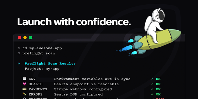 Scan your codebase for launch readiness before you ship. Preflight catches leaked secrets, broken configs, expired SSL, missing SEO tags, security gaps, and 70+ misconfigured services. Just run the command.