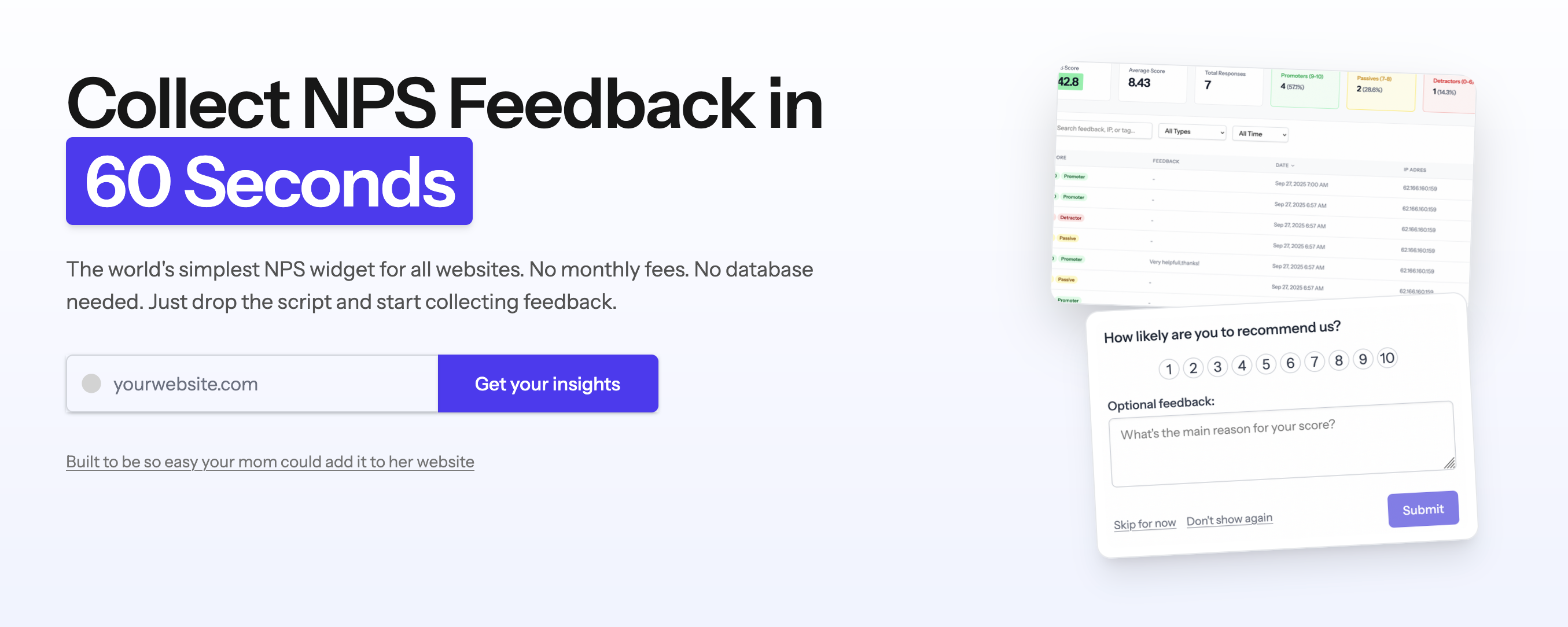 - Drop the NPSpack script into your website HTML and feedback collection starts instantly without setting up any database infrastructure