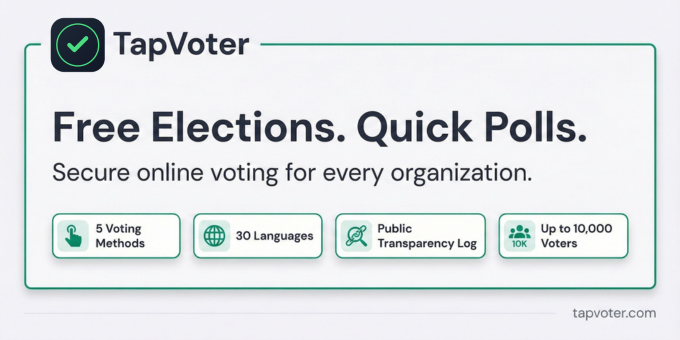TapVoter is a voting platform for organizations, teams, and communities. Run secure elections with 5 voting methods β Direct, Ranked Choice, Approval, STAR, and Multi-Winner β or launch instant public polls with shareable links. Elections are always free. Polls Pro adds analytics, rating scales polls, custom branding, election perks and more for $4.99/mo. 30 languages, real-time monitoring, and built-in transparency come standard.