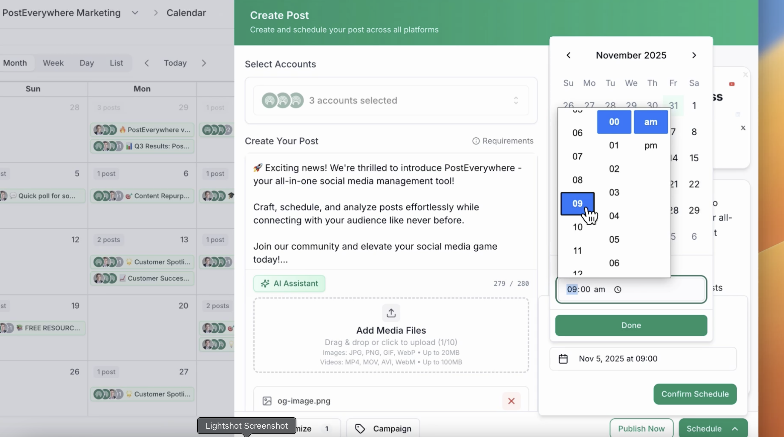 - Schedule posts for multiple platforms simultaneously with just a few clicks, letting you batch your content creation and save hours each week