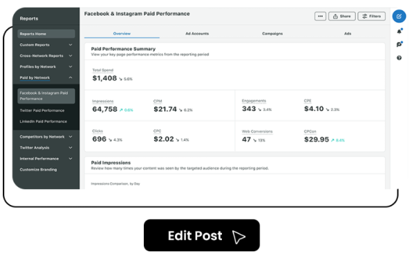 - Track performance metrics from Facebook, Instagram, Twitter, and LinkedIn all in one dashboard instead of jumping between different apps