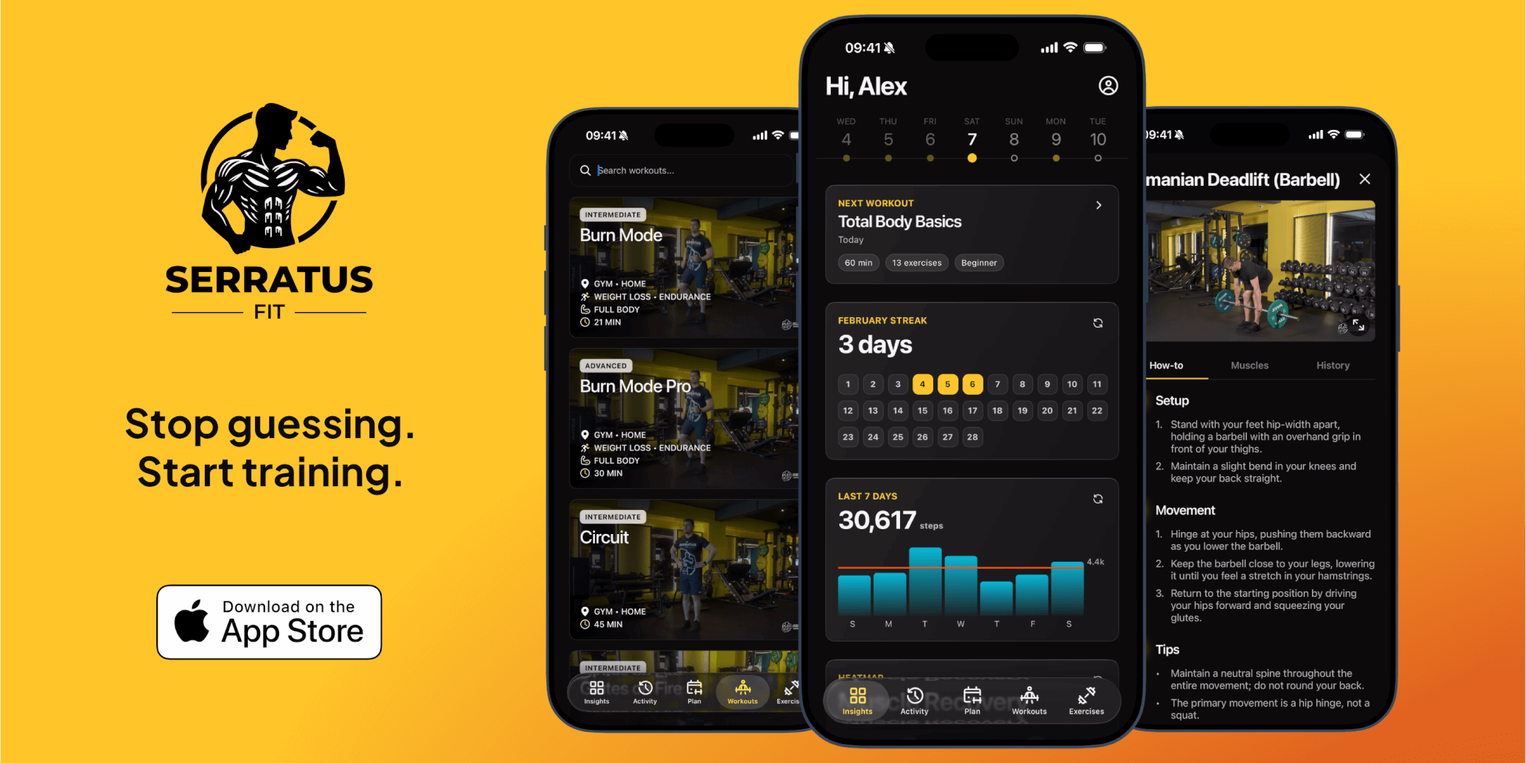 My co-founder, Alex, spent 10+ years as a pro rugby athlete. I'm the developer. Together we built Serratus Fit: a workout app where every program is hand-built by Alex, not generated by an algorithm. Structured plans that build week to week. 150+ exercises with real video demos and form cues. Progress tracking with volume trends, streaks, and PRs. Beginner to advanced. We're two people, no investors. PPP pricing so it's affordable globally. 7-day free trial, cancel anytime.
