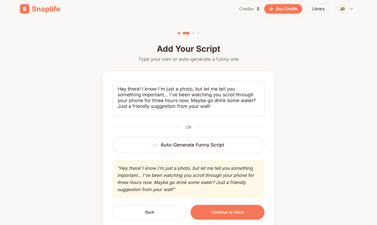 SnapLife turns any photo into a 30‑second talking video. Upload a photo, generate or write a script, pick a voice, and share your video instantly.