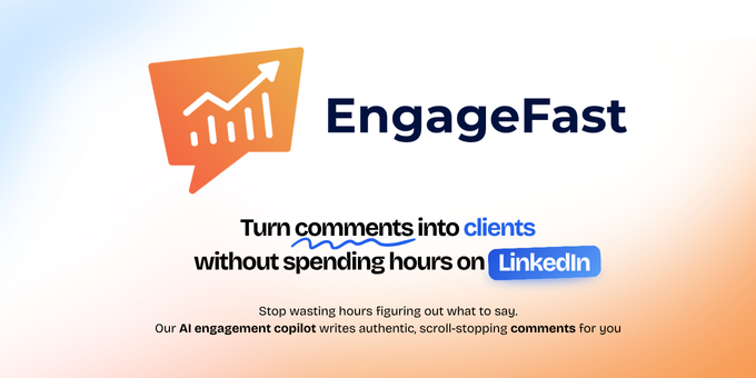 Growing and getting clients on LinkedIn requires daily engagement. But daily engagement on LinkedIn... sucks. EngageFast helps solopreneurs and busy founders grow visibility and drive clients from LinkedIn, without spending hours writing comments. It’s an AI copilot that writes natural, on-brand comments in your tone (no automation). You stay visible, build trust, and attract leads, all in 10min a day (instead of 2 hours).